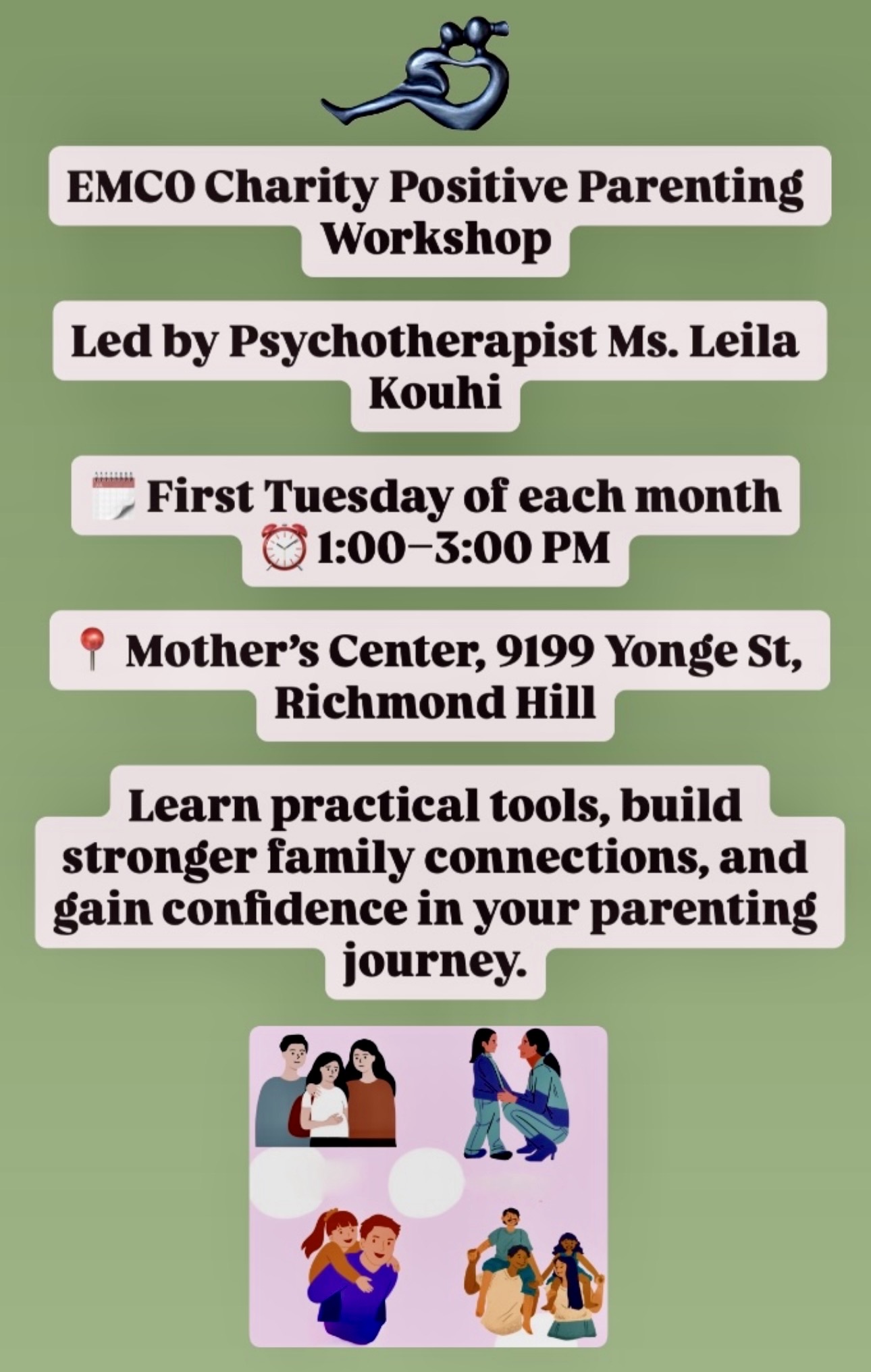 This event has passed. 03 Mar EMCO Charity Positive Parenting Workshop Organized By: EMCO Started: 3 March 2026 at 1:00 pm Ending: 3 March 2026 at 3:00 pm 9199 Yonge St +1(416)768-2217 info@emcoworld.org Closed First Tuesday of each month Learn practical tools, build stronger family connections, and gain confidence in your parenting journey. EMCOOrganizer