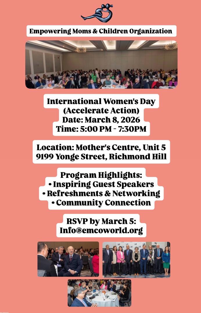 This event has passed. 08 Mar International Women’s Day Organized By: EMCO Started: 8 March 2026 at 5:00 pm Ending: 8 March 2026 at 7:30 pm 9199 Yonge St +1(416)768-2217 info@emcoworld.org Closed EMCOOrganizer
